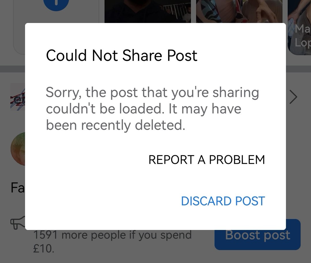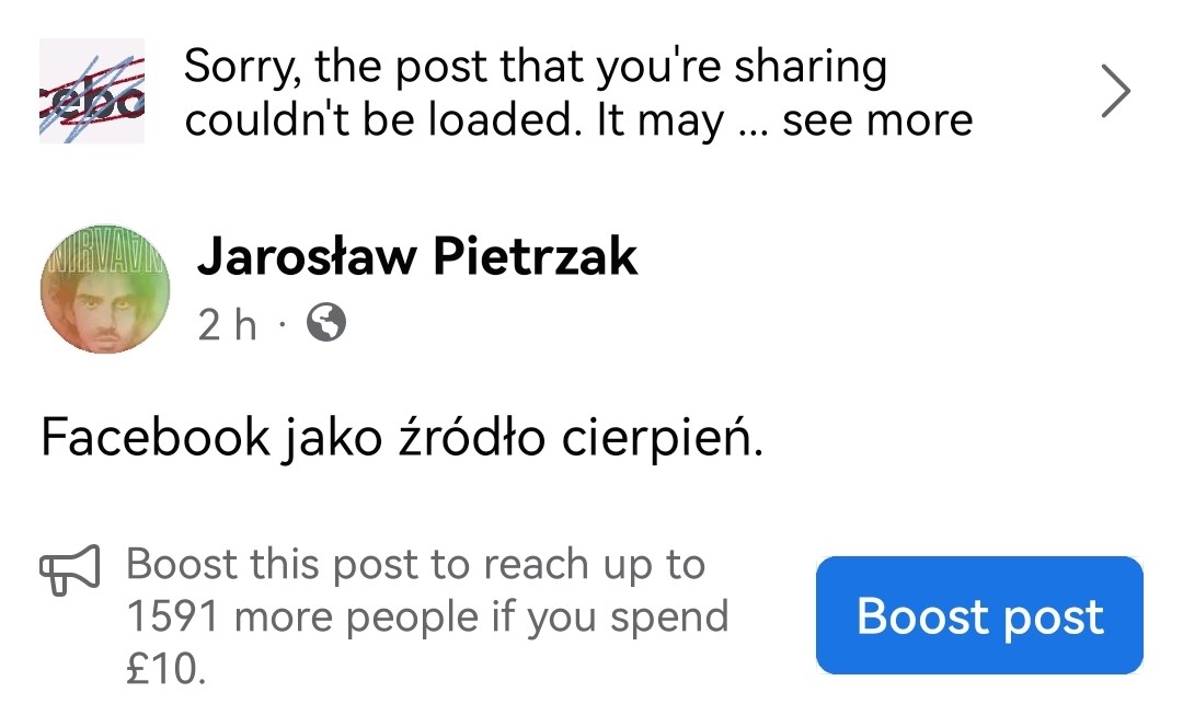 Kiedy sam go chciałem zaszerować dalej na swoim prywatnym koncie, spotkało mnie to samo. Facebook podawał oczywiście zautomatyzowany powód: nie da się szerować posta, być może jego treść została już usunięta. Facebook nie krępuje się wciskać autorom, którzy przecież wiedzą, czy usunęli sobie posta czy nie, że być może ich posty zostały usunięte, i to pewnie dlatego nie da się ich podać dalej. Załączam skriny. Zwróćcie uwagę, że jednocześnie Facebook bez żenady proponuje mi za jednym zamachem płatne promowanie „niedostępnego” („być może usuniętego”) posta. Nice.