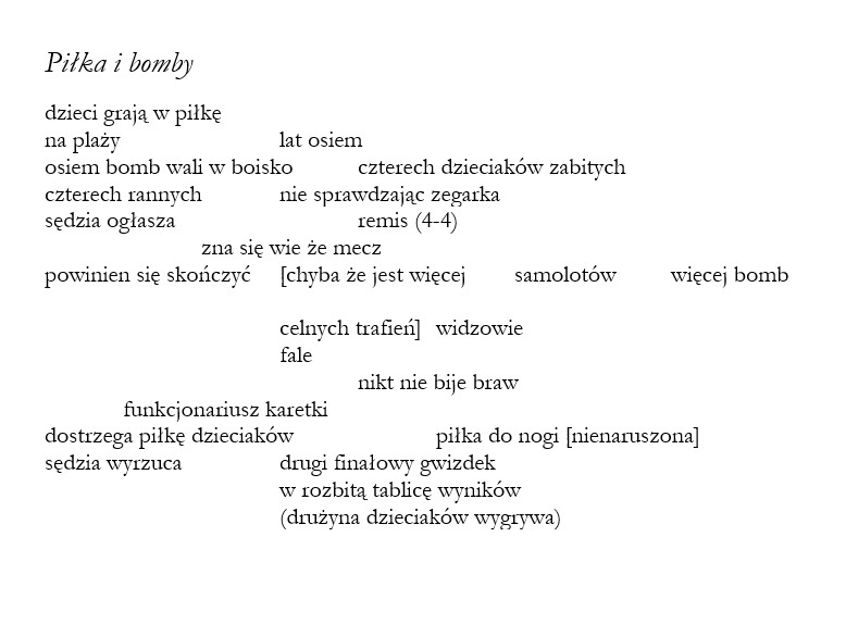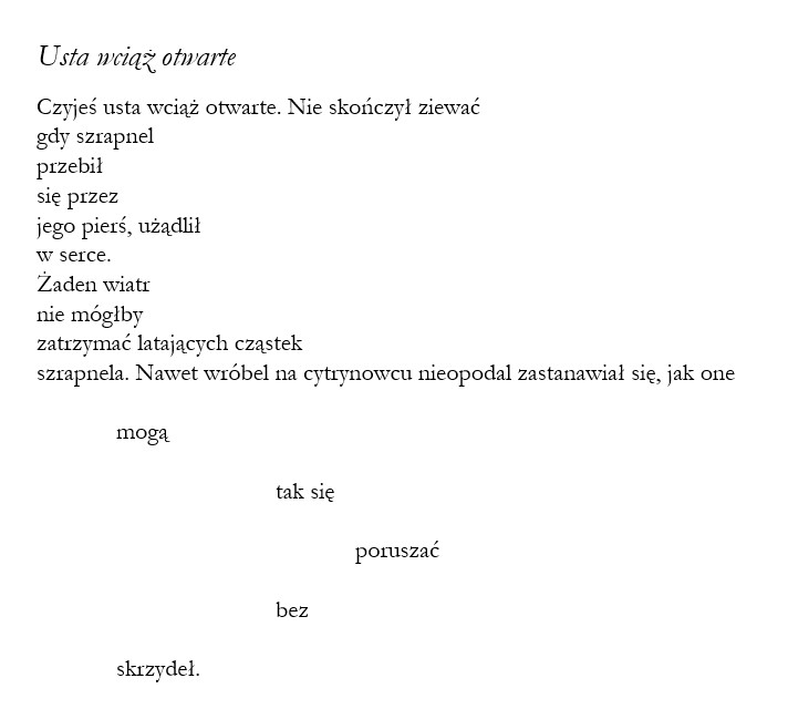 Są wreszcie takie, które poszukują sposobów, by rozpadanie się znanego poecie świata i ludzkiego życia w rozrywanym przemocą kolonialnego agresora na kawałki świecie oddać nie tylko słowami, ale ich graficznym rozmieszczeniem na stronie. Nie widziałem jeszcze tomu Rifka Mohammeda el-Kurda, ale na podstawie tego, co już się było ukazało w przekładzie w „Dwutygodniku”, el-Kurd robi chyba czasem podobnie.