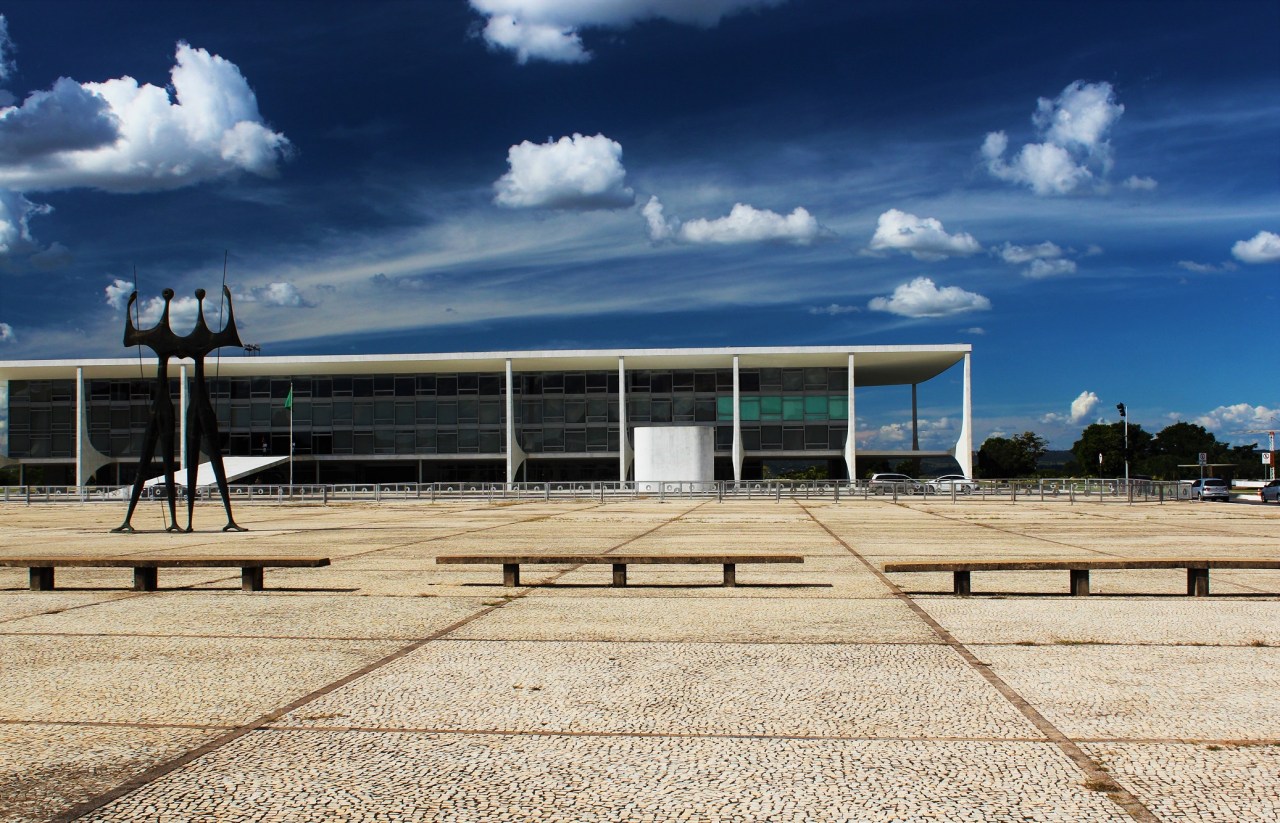 W miejscu kokpitu, bo plan Brasílii jej twórcy – urbanista Lucio Costa, architekt krajobrazu Roberto Burle Marx i wielki modernistyczny architekt, wyznawca Le Corbusiera, Oscar Niemeyer – rozpięli na rysunku samolotu. Oś Monumentalna to jego kadłub. Samolot, maszyna umożliwiająca człowiekowi latanie, wcielenie techniki jako zdolnej otworzyć przed człowiekiem zupełnie nowe możliwości, wykraczające daleko poza to, co oferują naturalne możliwości ciała homo sapiens sapiens – to symbol nowoczesności już od czasu awangard pierwszych dekad XX wieku (Kazimierz Malewicz postulował w pewnym momencie ich kadłuby i skrzydła jako najwłaściwsze miejsce dla swoich suprematystycznych kompozycji). To także wyraz jej – nowoczesności – ówczesnego optymizmu i wiary we własną zdolność przeobrażania świata i pokonywania ograniczeń, jakie stawia człowiekowi.